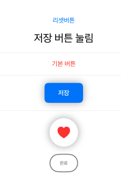 // property // @State: UI 화면에 변경이 되면 자동으로 알아차려서 UI 화면에 업데이트를 해줌. @State var mainTitle: String = "아직 버튼 안눌림" var body: some View { VStack (spacing: 20) { // 리셋 버튼 Button { // Action: 사용자가 버튼을 클릭할 경우 작업 수행 메서드 mainTitle = "리셋" } label: { // Label: 텍스트, 아이콘 등 버튼을 라벨링하기 Text("리셋버튼") } // 라벨 Text(mainTitle) .font(.title) Divider() // 1번 버튼 // action 은 button을 눌렀을때 실행할 event 넣기 // label 은 button 모양을 디자인 하기 Button { // action mainTitle = "기본 버튼 눌림" } label: { // label Text("기본 버튼") } .accentColor(.red) Divider() // 2번 버튼 Button { mainTitle = "저장 버튼 눌림" } label: { Text("저장") .font(.headline) .fontWeight(.semibold) .foregroundColor(.white) .padding() // 왜 padding을 2개를 쓰는거지? .padding(.horizontal, 20) .background( Color.blue .cornerRadius(10) .shadow(radius: 10) ) } Divider() // 3번 버튼 Button { mainTitle = "하트 버튼 눌림" } label: { Circle() .fill(Color.white) .frame(width: 75, height: 75) .shadow(radius: 10) .overlay( Image(systemName: "heart.fill") .font(.largeTitle) .foregroundColor(Color.red) ) } // 4번 버튼 Button { mainTitle = "완료 버튼 눌림" } label: { Text("완료") .font(.caption) .bold() .foregroundColor(.gray) .padding() // 상하좌우에 균등한 기본 패딩(여백)을 추가 함. .padding(.horizontal, 10) // 가로 방향으로 10포인트 추가 패딩을 적용 .background( Capsule() .stroke(Color.gray, lineWidth: 2.5) ) } } }