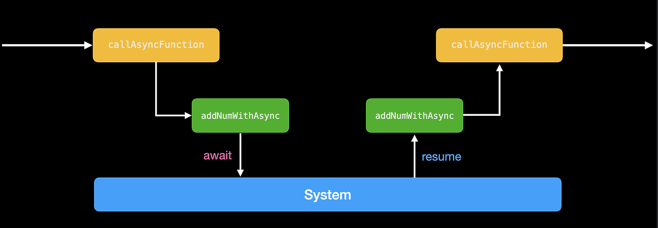 addNumWithAsync() 메소드를 호출하게 되면 그 지점이 Suspension Point가 되고, Thread 제어권은 System에게 넘기게 됩니다.
