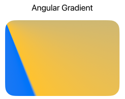 // Angular Gradient Text("Angular Gradient") .font(.title2) RoundedRectangle(cornerRadius: 25) .fill( AngularGradient( gradient: Gradient( colors: [ Color.blue, Color.yellow ] ), center: .topLeading, // angle: .degrees(180 + 45) // 각도 값 angle: .degrees(75) // 각도 값 ) ) .frame(width: 300, height: 200)